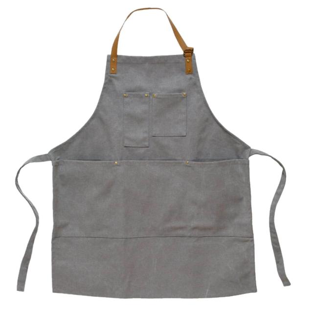 しっかりした厚手のキャンバス生地のエプロンです。ウオッシュ加工された生地で、女性にも男性にも合うシンプルなデザイン。首の紐は合皮で、ポケットはビンテージ調のリベットで留められています。大きめポケットの扱いやすいエプロンです