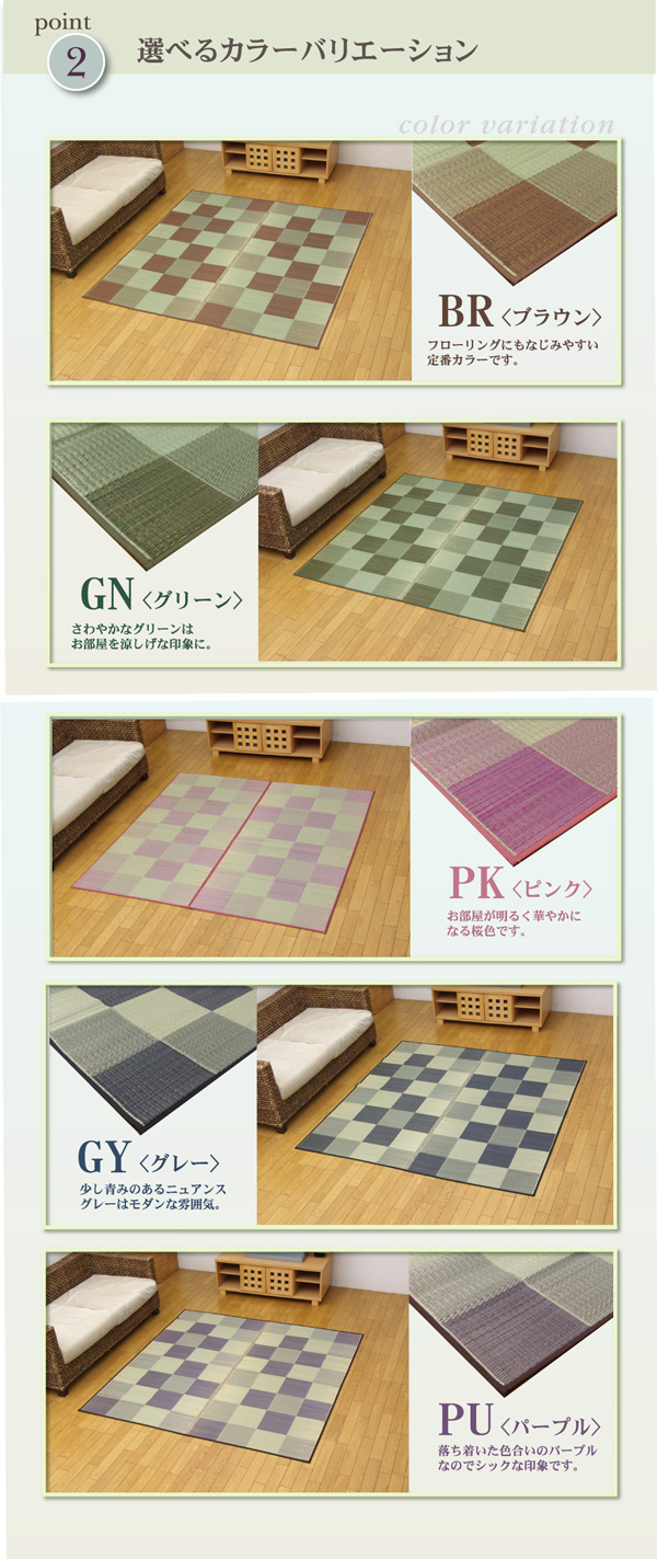 | 説明 | シンプルで飽きのこないブロック柄のい草カーペットです。 国産(九州産)のい草を使用しています。 一本一本が太く、表皮が厚く繊維がキメ細かいので弾力性があり、耐久性に優れています。 い草には空気の自然浄化作用、湿度の調節作用などがあります。 また汚れにくく、使用するうちに黄金色に変化し味が出ます。 い草に青森ヒバ加工を施しています。 (抗菌、防臭効果) |