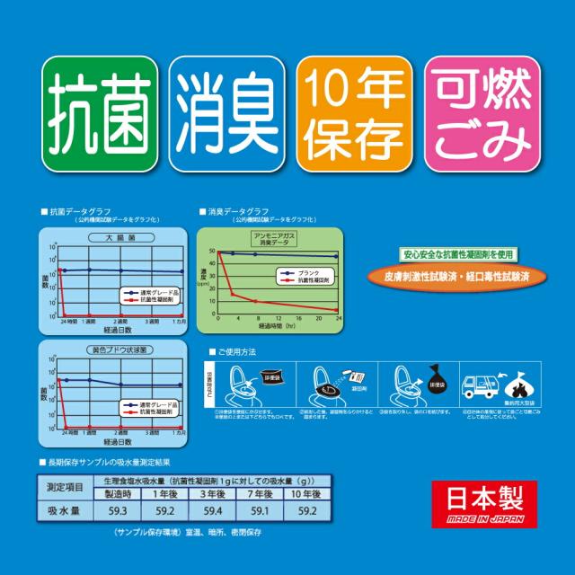 抗菌性凝固剤は、水分を吸収して汚物を素早く固め抗菌、消臭効果が長時間持続します。