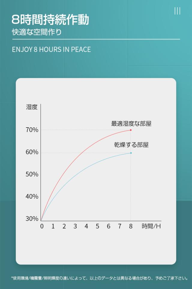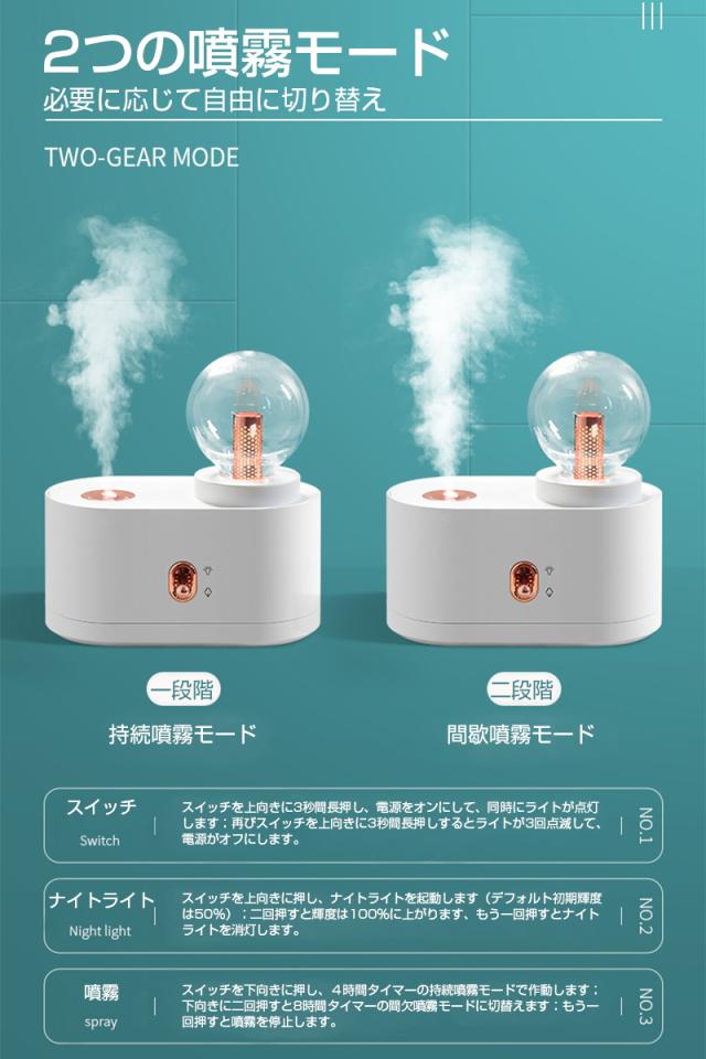 【2つの噴霧モード】スイッチを下向きに押し、4時間タイマーの持続噴霧モードで作動します;下向きに二回押すと8時間タイマーの断続噴霧モードに切替えます;もう一回押すと噴霧を停止できます。