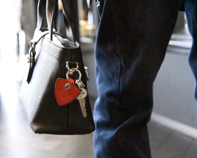 革の経年変化が楽しめるピック型のキーホルダー。