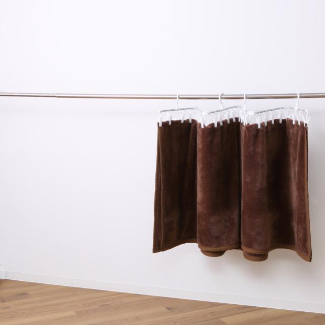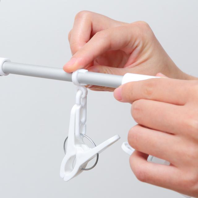 折りたたむと幅約10.5cmとスリムになり、収納時も場所をとりません。竿に掛けたままフックを固定すれば、片手で簡単に伸ばしてすぐに使えます。