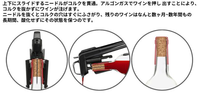 Coravinワインシステムは、革新的な特許テクノロジーを使用してワインを酸化から防ぎます。特殊ニードルで天然コルクに穴をあけ、不活性ガス(アルゴンガス)をボトルに注入しながら、ワインをグラスに抽出します。ボトルのワインは不活性ガスで蓋をされ、天然コルクのニードルの穴も元通り。数か月〜数年、ワインはいつでも開けたての状態をお楽しみ頂けます。