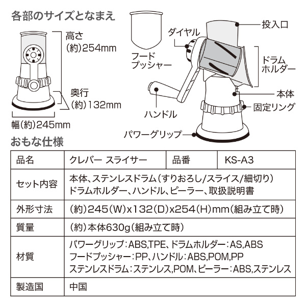 ■品番:KS-A3■外形寸法(約):W245×D132×H254mm(組み立て時)■質量(約):本体630g(組み立て時)■材質:●パワーグリップ/ABS、TPE●ドラムホルダー/AS、ABS●フードプッシャー/PP●ハンドル/ABS、POM、PP●ステンレスドラム/ステンレス、POM●ピーラー/ABS、ステンレス■製造国:中国