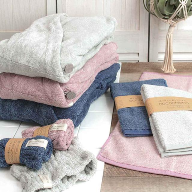 『cocochiena(ココチエナ)』シリーズは、ヘアターバンの他に、バスローブ、バスマット、タオルまでアイテムのラインナップも充実しており、シリーズでコーディネートしていただけます。どの商品でも、触り心地・使い心地・洗い心地、そのたびに変わらない「心地いい」を感じられます。