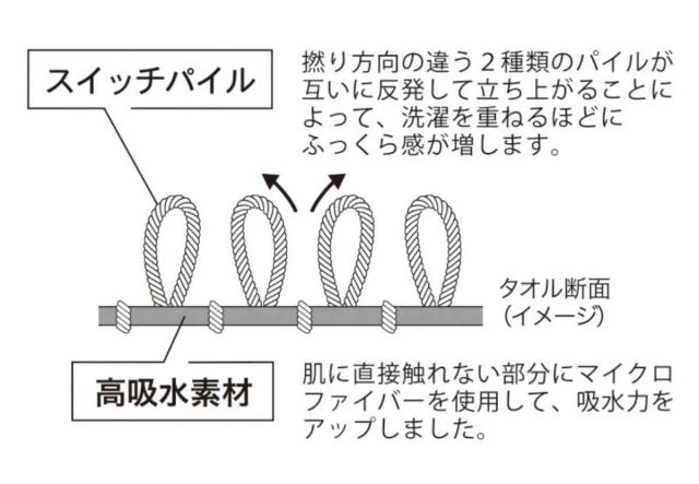 スイッチパイルは洗ってもパイルがへたりにくく、膨らみのある風合いを持続させる製造技術です。一般のタオルの3倍の吸収力があります。