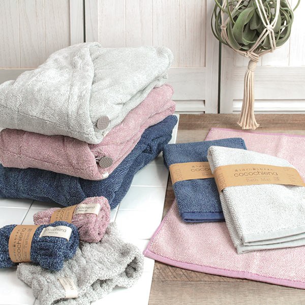 『cocochiena(ココチエナ)』シリーズは、バスローブの他に、ヘアターバン、バスマット、タオルまでアイテムのラインナップも充実しており、シリーズでコーディネートしていただけます。どの商品でも、触り心地・使い心地・洗い心地、そのたびに変わらない「心地いい」を感じられます。