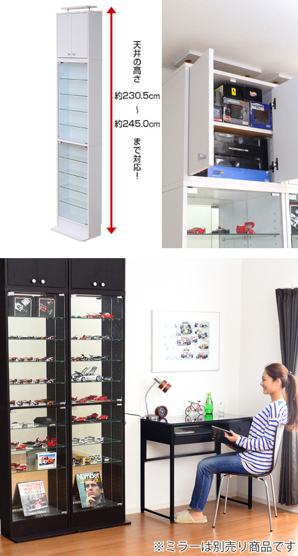 大型のフィギュアも収納可能なハイタイプのコレクションラックです。高さ180cmの本体に上置き棚を置くことによって、収納力がさらにUPします。上置き棚には突っ張りが付いているので、横揺れが少なくなり安全性が高くなります。また別売りのミラーを付ければ、コレクションを正面から360度楽しむことができます。