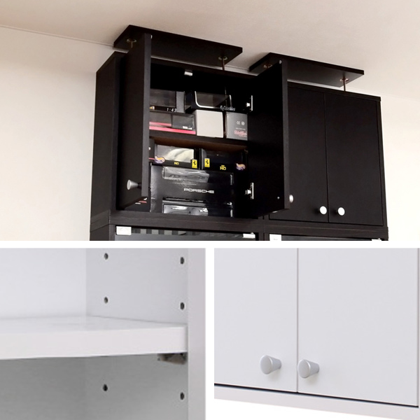 上置き棚の棚も収納物に合わせて高さを調節でき、ムダなく収納していただけます。また、取っ手が付いているので、中の物が取り出しやすいです。