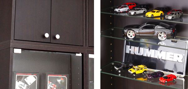 ガラス棚は全段可動式で、収納するコレクションによって高さの調節が可能です。また、ガラス板専用の吸盤式棚ダボが付いていますので、ガラス棚をしっかりと支えてくれます。