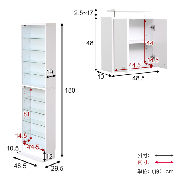 | サイズ | 約 幅48.5×奥行29.5×高さ228(cm) 奥行(29.5cm)はボトムステージ(10.5cm)を含む 突っ張り:2.5〜17cm調整可能 |