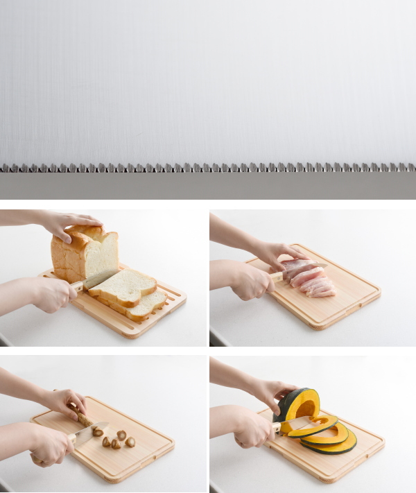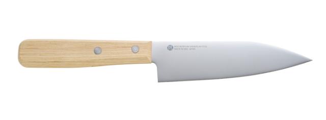刃に細かなギザ刃加工(ファインソー加工)を施してあるので、切れ味が長持ちすると共に刃滑りしにくく食材をしっかりととらえます。鶏肉や魚、トマトもスパッと切れます。刃渡りを14cmと少しコンパクトにすることで女性でも手軽に扱える使いやすいサイズにしています。刃の先端形状を通常の三徳より細めにすることで細かな作業もしやすいです。柄は天然木を使用しているので触った感じも温かみを感じられ、見た目にも高級感があります。伝統ある日本刀鍛練と現代工業技術を結集させた名産地「関」で作られた包丁です。刃はステンレス鋼とモリブデンバナジウム鋼が混合されたサビに強く粘り強い材質です。