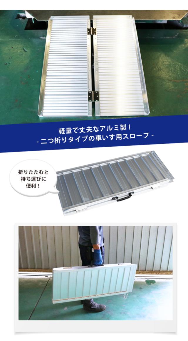 ●丈夫なアルミ製スロープです(蝶番はステンレス) ●二つ折りなので、スロープの脱着が容易に行えます ●持ち手付きなので、持ち運びが容易になり様々な場所で使用できます ●表面は凸凹滑り止め/サイドは脱輪防止の曲げ加工を施しています(高さ40mm) ●全長に対して25%以下の段差でお使い下さい 【 ご注意 】 ・力の強さは個人差がありますので女性や力が弱い方は二人以上で作業してください ・アルミスロープの扱いは本体重量をよく確認してお使いください ・車いす専用ですので、その他台車等には使用しないで下さい *商品は組立済みの状態でお届け致します ※外見保証はございません 新品ですが輸入・工業製品のため商品の性質上、擦りキズがある場合がございますが予めご了承ください