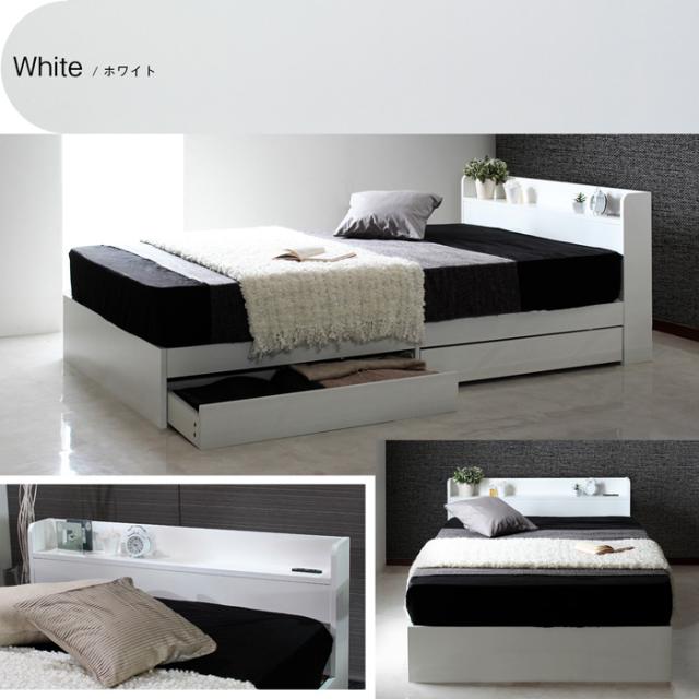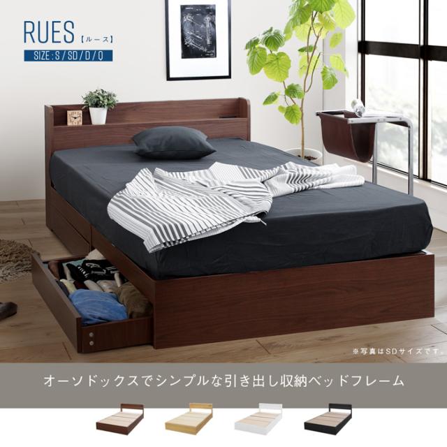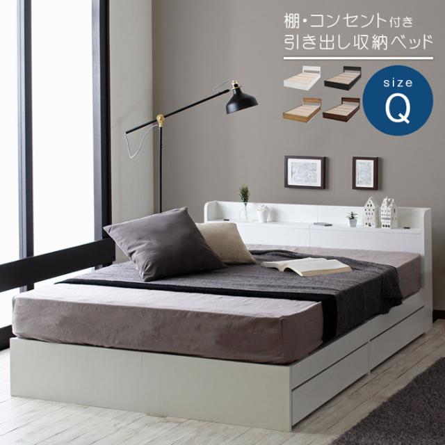 【2口コンセント・棚付き】ベッドフレーム RUES(ルース) クイーン 4色対応 多機能ベッド クイーンベッド フレーム単品 引出し付き 収納付き 引き出し収納 収納ベッド 木製 木製ベッド モノトーン 巾木よけ