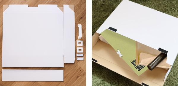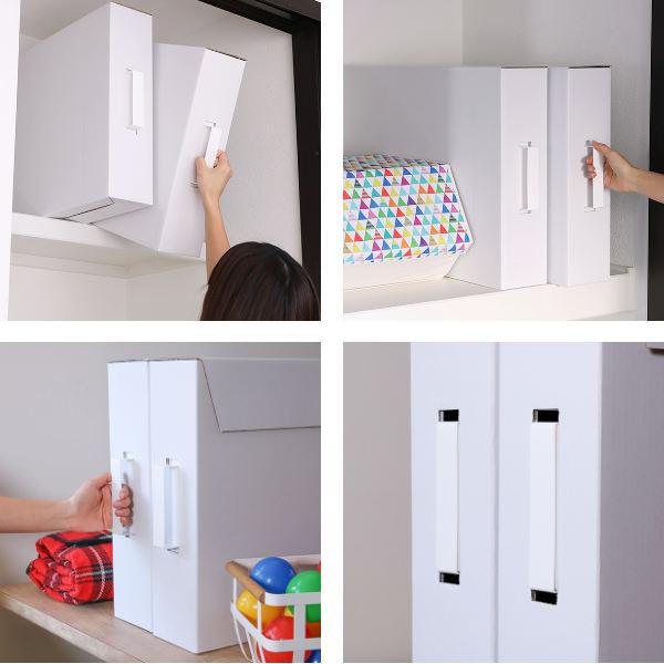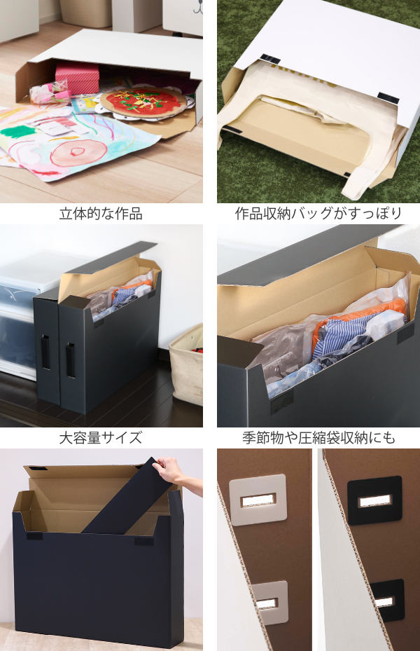 立体的な作品や、作品収納バッグがそのまますっぽり入る作品収納ボックスは、厚みのある季節物や圧縮袋収納としても役立ちます。収納ボックスの形を守る底板や差し込み口の補強シールも付いています。