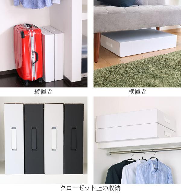 縦・横収納可能なので、押し入れやクローゼットの隙間に気持ちよく収納できる嬉しいサイズ感です。無駄のないシンプルスタイリッシュな形状で、隙間約12cmの省スペースに気持ちよく収納できます。