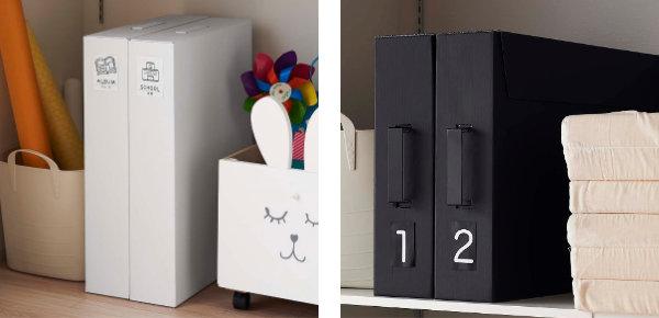 シンプルモノトーンの収納ボックスは、お気に入りのラベルシールで統一感のある収納空間をつくることができます。種類別やお子様の年齢ごとにラベリングしておくと、お目当ての作品がすぐに見つけ出せそうですね。