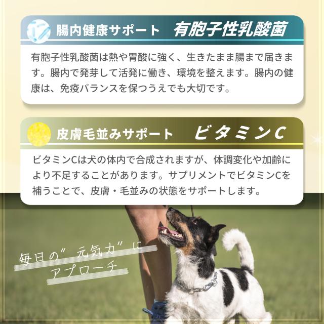 ●加齢による衰えがちな免疫機能を健康維持により抵抗力を保つ天然成分のみを使用した犬用健康サプリメント。