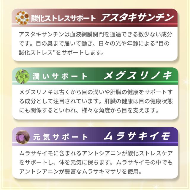 | 原材料 | ビール酵母、ムラサキイモ末、デキストリン、チキンエキス、ブルーベリーエキス末、プロポリスエキス末、ビタミンC、マリーゴールド色素(ルテイン含有)、ヘマトコッカス藻色素(アスタキサンチン含有)、メグスリノキ抽出物 |