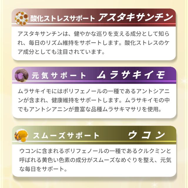 | 原材料 | 米粉、ビール酵母、チキンエキス、デキストリン、乾燥ローヤルゼリー末、ムラサキイモ末、ウコン末、イチョウ葉エキス末、ビタミンC、プロポリスエキス末、ヘマトコッカス藻色素(アスタキサンチン含有) |