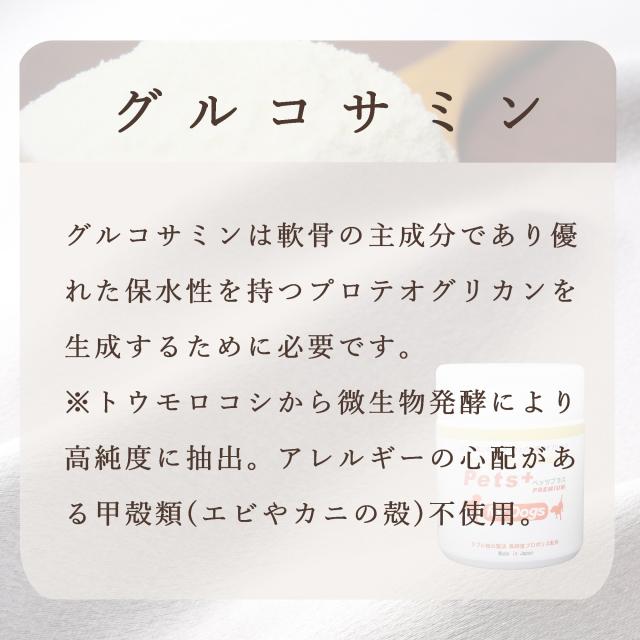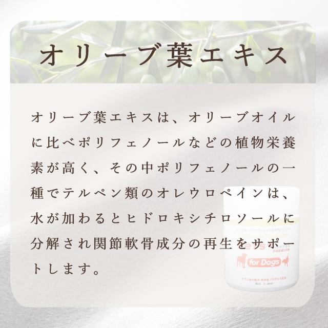 | 原材料 | 米粉、ビール酵母、チキンエキス、デキストリン、グルコサミン、ムラサキイモ末、サケ軟骨抽出物(コンドロイチン含有)、レバーエキス(豚)、MSM、ビタミンC、プロポリスエキス末、オリーブ葉エキス末、ヒアルロン酸 |