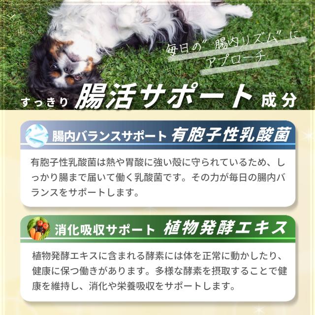 ●腸内に善玉菌、酵素と乳酸菌で健康を維持し腸内環境を保つ天然成分のみ使用した犬用健康サプリメント。