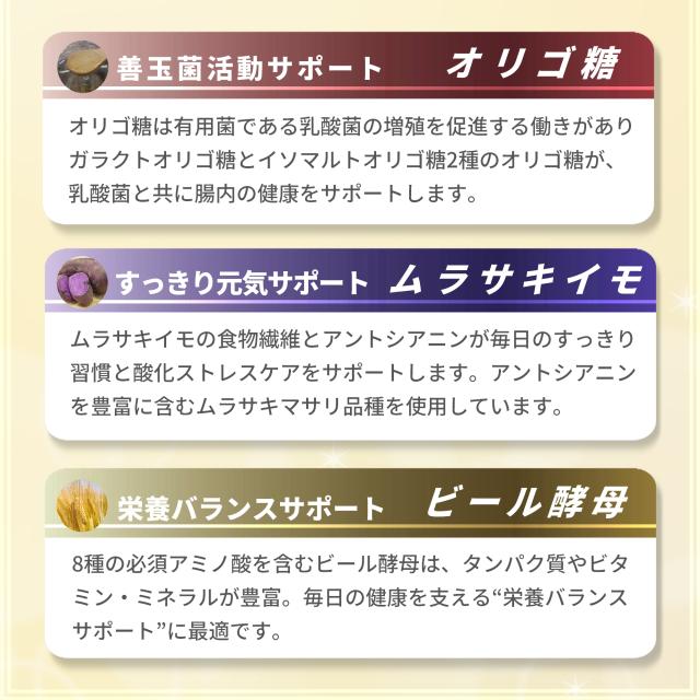 | 原材料 | 米粉、ビール酵母、米糠、チキンエキス、デキストリン、ムラサキイモ末、ビタミンC、植物発酵エキス末、有胞子性乳酸菌、ガラクトオリゴ糖、イソマルトオリゴ糖、プロポリスエキス末 |