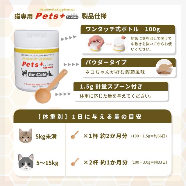 商品名:猫専用サプリメント ペッツプラス プレミアムセブン 名称:猫用栄養補助食品 内容量:100g 形状:粉末 賞味期限:パッケージに記載 保存方法:常温保存 原産国:日本 |