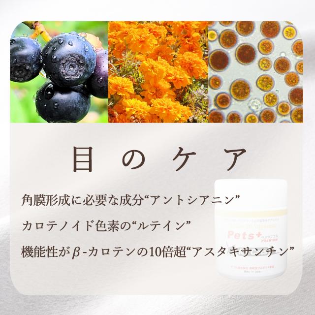 | 原材料 | 鰹節粉末、ビール酵母、カツオエキス、マタタビ末、グルコサミン、米糠、プロポリスエキス末、乾燥ローヤルゼリー末、卵黄末、アガリクスエキス末、サケ軟骨抽出物(コンドロイチン含有)、有胞子性乳酸菌、ウコン末、MSM、イチョウ葉エキス末、V.C、植物発酵エキス末、ブルーベリーエキス末、オリーブ葉エキス末、ガラクトオリゴ糖、イソマルトオリゴ糖、抽出V.E、カロテン色素、ヘマトコッカス藻色素(アスタキサンチン含有)、ナイアシン、マリーゴールド色素(ルテイン含有)、ヒアルロン酸、パントテン酸カルシウム、V.B1、V.B6、V.B2、V.A、葉酸、V.D、V.B12 |