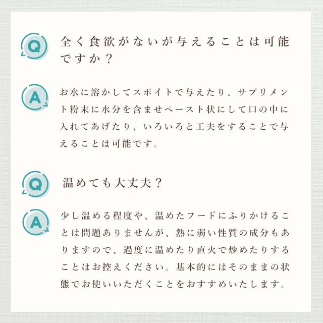下記を目安に1日1回、または数回に分けて普段の食事キャットフードなどに混ぜて食べさせてください。食欲がない場合はミルク、ヨーグルト、流動食、粉末のスープなどに混ぜて与えるのも良い方法です。