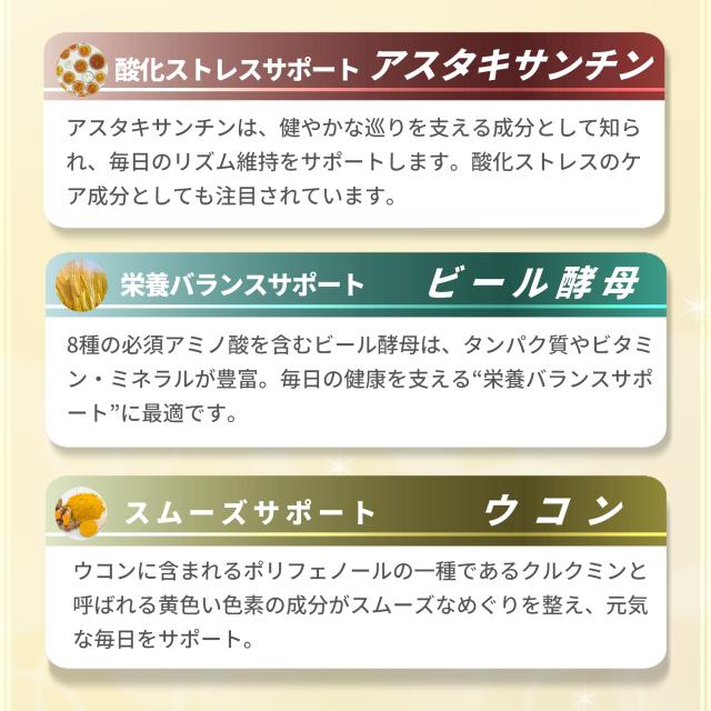 ●高純度プロポリス、ローヤルゼリー、イチョウ葉エキス、アスタキサンチンを主成分として配合。