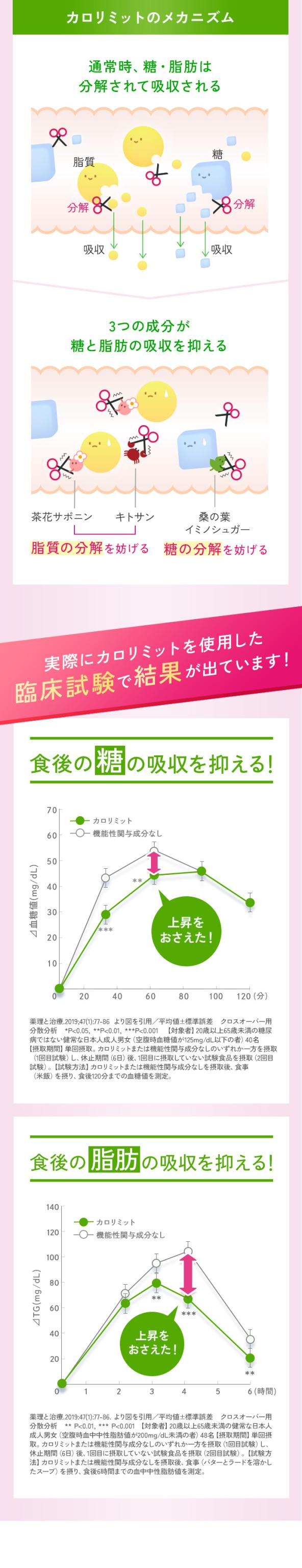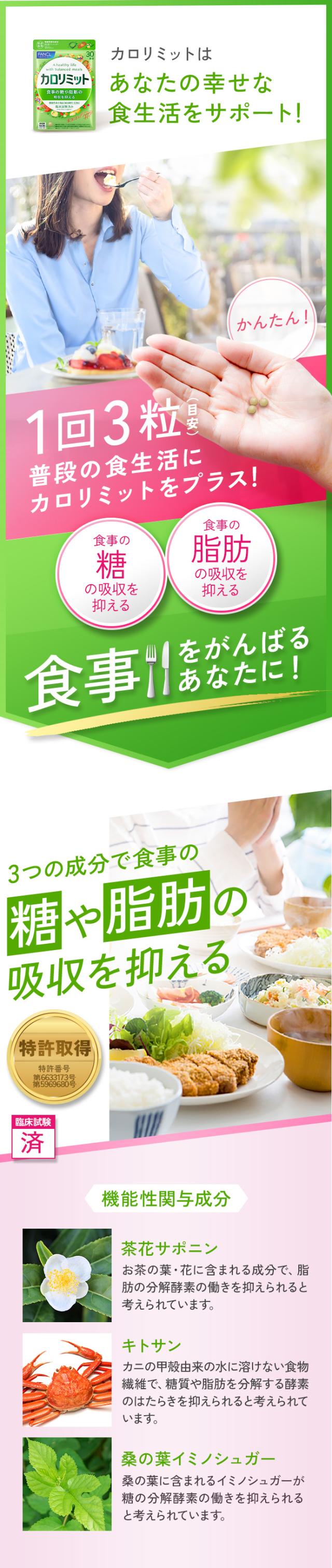 食事の糖や脂肪の吸収を抑えるカロリミット。注目の「茶花サポニン」に、桑の葉イミノシュガー、キトサンの3成分がしっかり働きます!1回の粒数も3粒で摂りやすく、食後の血糖値と中性脂肪値の上昇を抑える機能があります。