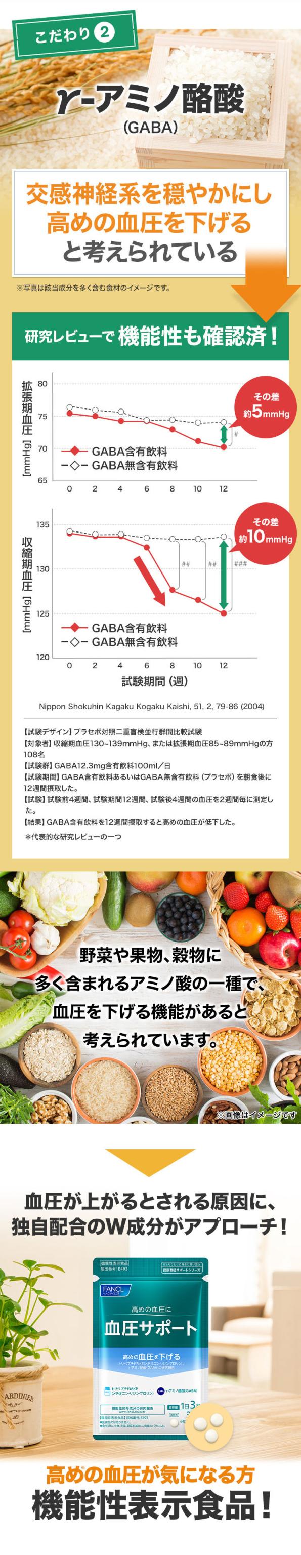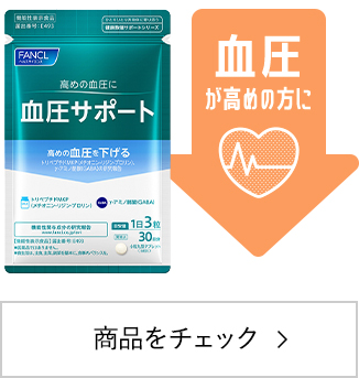 日本初(※1)!高めの血圧を下げると報告されている「トリペプチドMKP」と「γーアミノ酪酸(GABA)」を複合配合。高め(※2)の血圧を下げる機能性表示食品。ファンケルならではのダブルの力で、多角的にアプローチします。