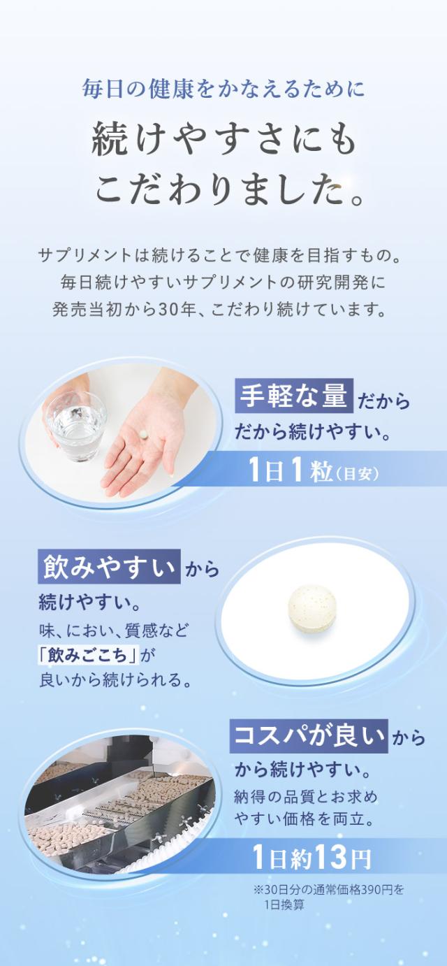 カルシウムの吸収を助けるほか、さまざまな働きが期待できることで近年注目されているビタミンD。紫外線を浴びることが少なくなった現代人はビタミンDが不足しがち。また、年齢とともに体内の合成力も低下するので、積極的な補給が必要です。ファンケルは乳化型のビタミンDで吸収にもこだわっています。