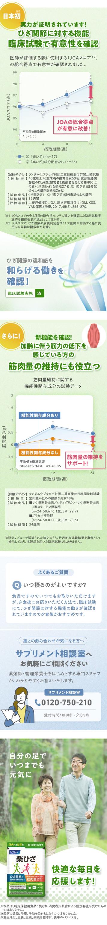 ひざ関節の違和感を和らげる機能性表示食品。階段の昇り降り、歩く、しゃがむなど、日常生活でひざ関節が気になる方に。日本初!2つの軟骨成分「プロテオグリカン」「II型コラーゲン」を配合した臨床試験実施済みの機能性表示食品。(※1)[届出番号:I1216]