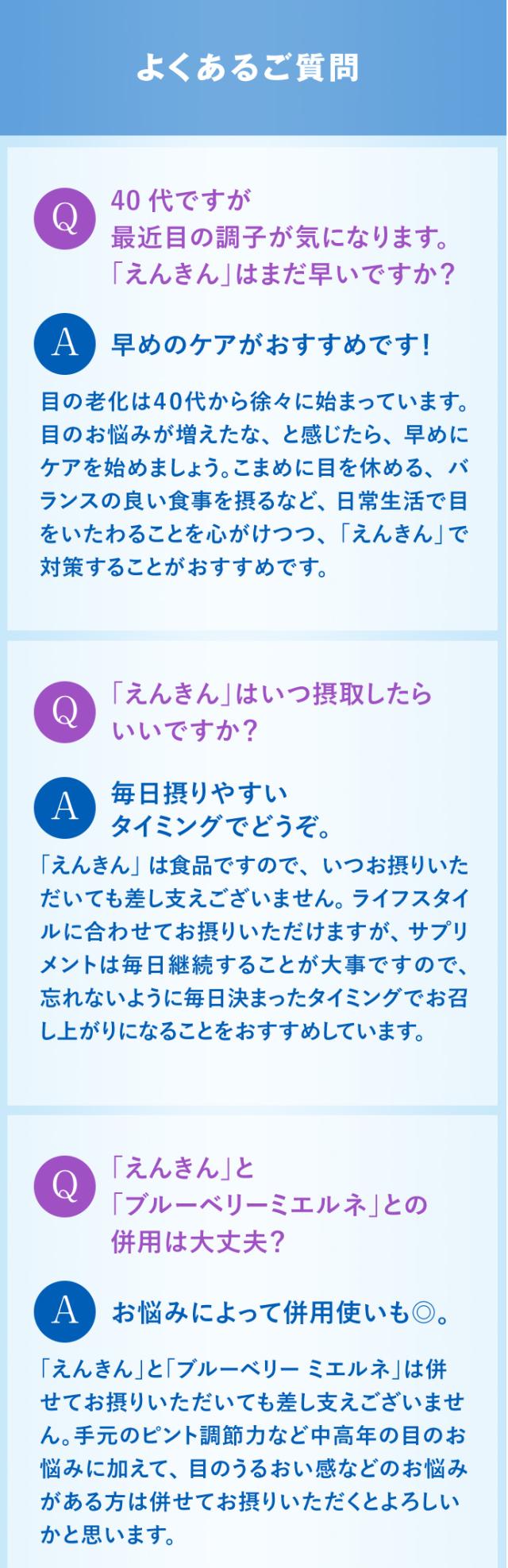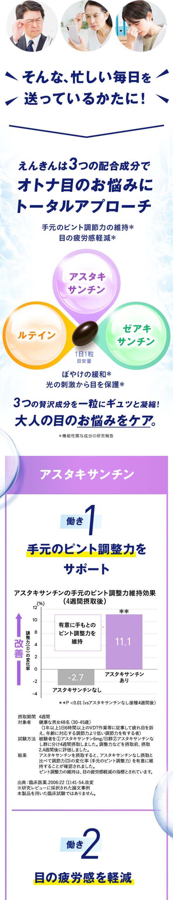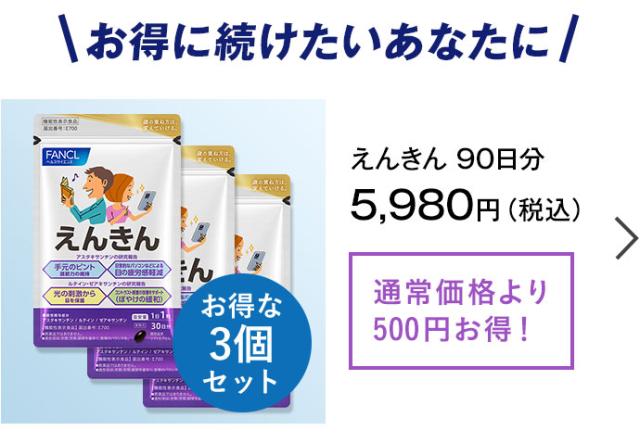 「えんきん」は、ファンケルが厳選した3成分アスタキサンチン、ルテイン、ゼアキサンチンを複合配合した機能性表示食品です。手元のピント調節力を維持し、目の疲労感を軽減する機能、光の刺激から目を保護し、ぼやけの緩和によってはっきりと見る力をサポートする機能(※)が確認されています。クリアな毎日のために、早めのケアを始めましょう。