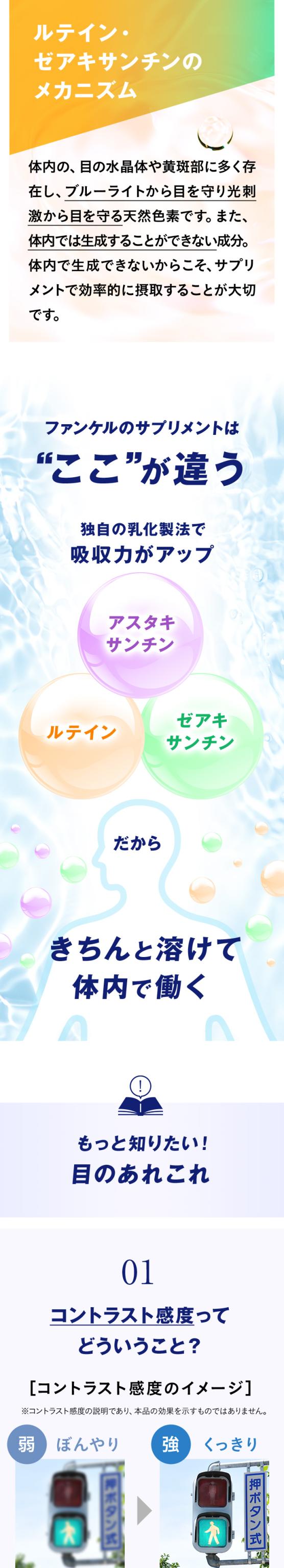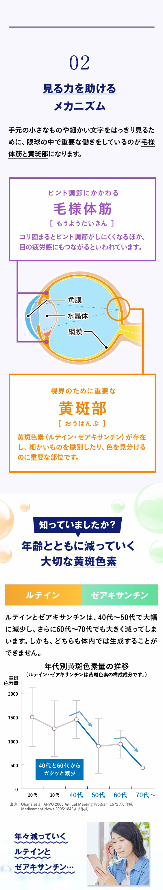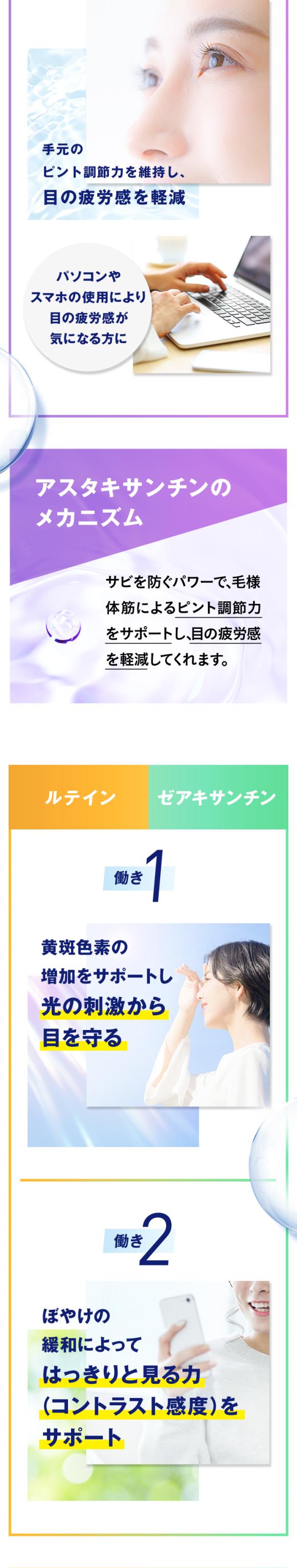 本品にはアスタキサンチン・ルテイン・ゼアキサンチンが含まれます。アスタキサンチンは、手元のピント調節力を維持し、日常的なパソコンなどによる目の疲労感を軽減することが報告されています。また、ルテイン・ゼアキサンチンは黄斑部の色素を増加させ、光の刺激から目を保護し、ぼやけの緩和によってはっきりと見る力(コントラスト感度)をサポートすることが報告されています。
