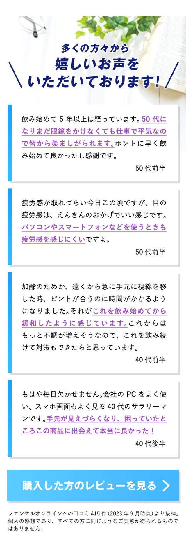 - 夕方になると特に目の疲れが厳しく、手元が見にくく困っていました。以前飲み続けて良かったのでまた注文しました。翌日には届きました。これでひと安心!