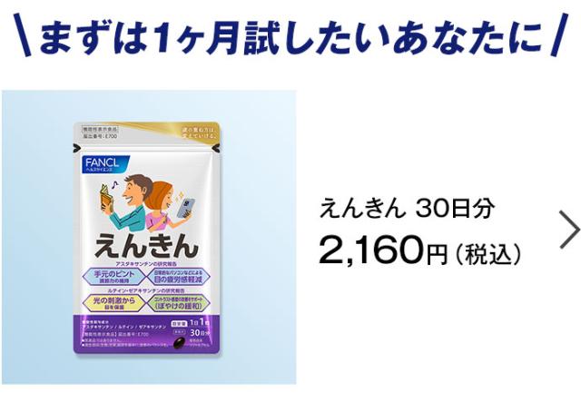 「えんきん」は、ファンケルが厳選した3成分アスタキサンチン、ルテイン、ゼアキサンチンを複合配合した機能性表示食品です。手元のピント調節力を維持し、目の疲労感を軽減する機能、光の刺激から目を保護し、ぼやけの緩和によってはっきりと見る力をサポートする機能(※)が確認されています。クリアな毎日のために、早めのケアを始めましょう。