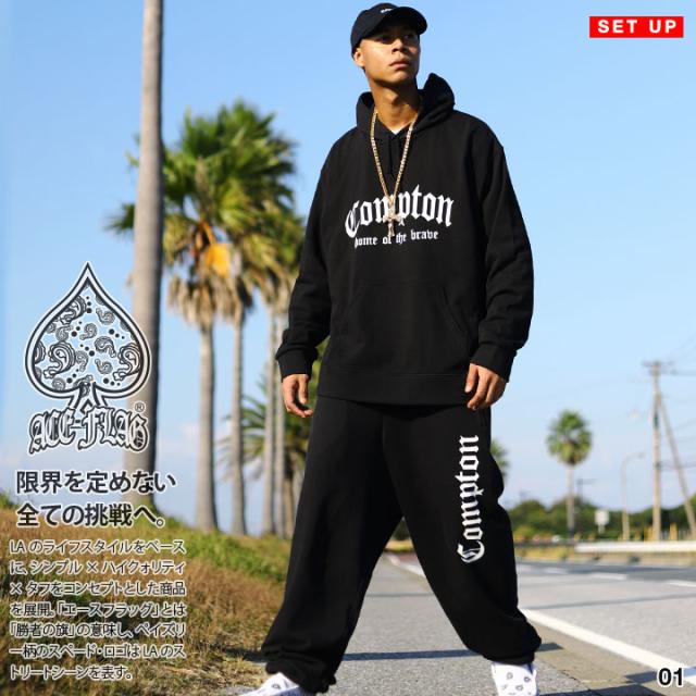 ACE FLAG 上下セット 長袖 メンズ 黒/白 大きいサイズ エースフラッグ セットアップ パーカー フーディ ゆったり Compton コンプトン LA ビッグシルエット ローライダー b系 ヒップホップ ファッション ストリート系 ハイ AF-SE-PA-041