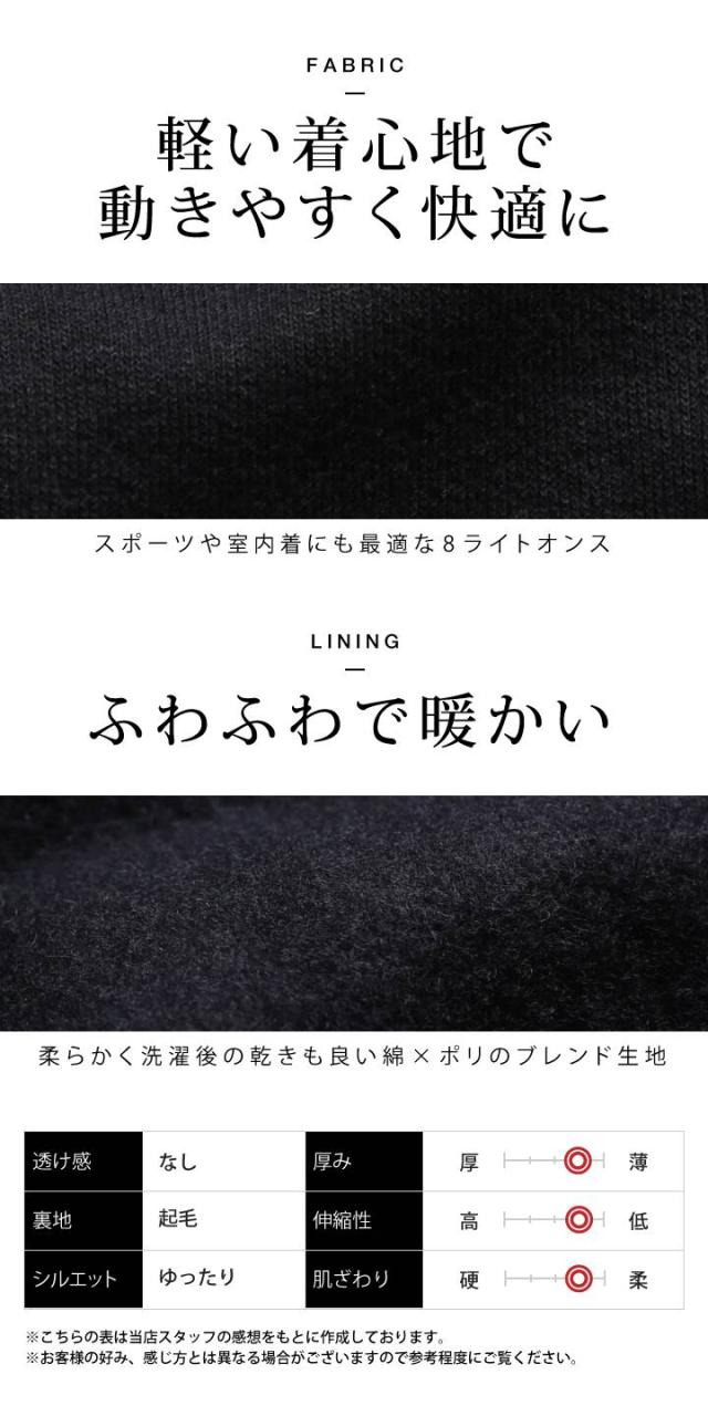 生地は、1枚でもシルエットがビシッとキマる程よい厚みが人気の8.0ozの裏起毛スウェット(下は9.7ozの裏パイルスウェット)。
