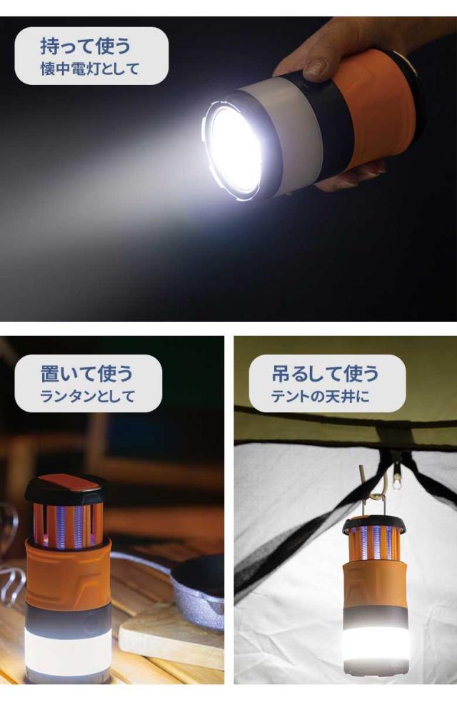 ●ハンディライト・ランタン・電撃殺虫器が一つになり、アウトドアやキャンプでの使用に大活躍です。