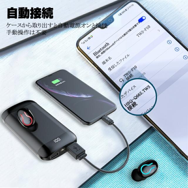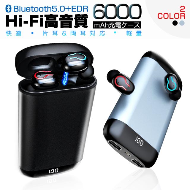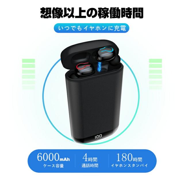 ワイヤレスヘッドセット Bluetooth5.0 イヤホン ワイヤレスイヤホン 防水 防滴 自動ペアリング 両耳 左右分離型 Hi-Fi高音質 バッテリー残電量表示 軽量 マイク内蔵 6000mAh大容量 充電式収納ケース付き 完全ワイヤレス 送料無料