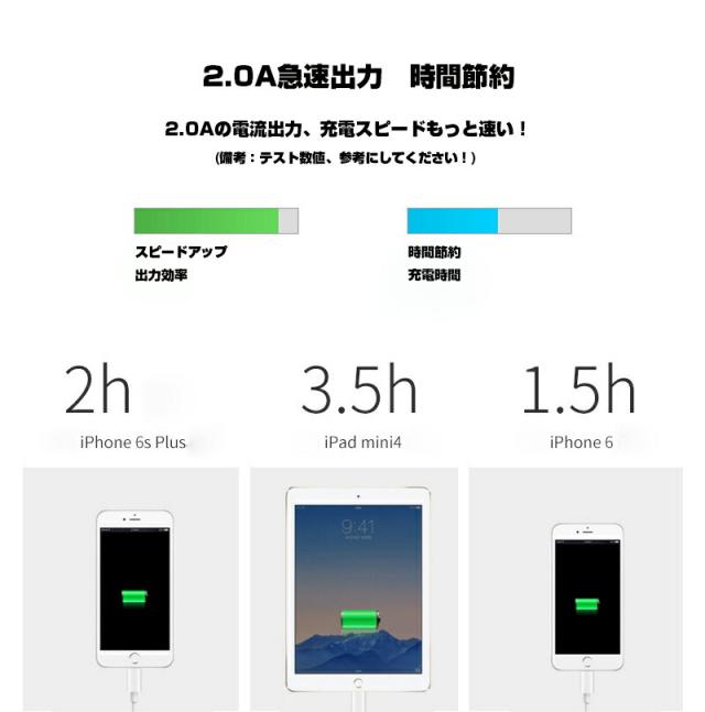 2.0A急速出力 時間節約 2.0Aの電流出力、充電スピードもっと速い!