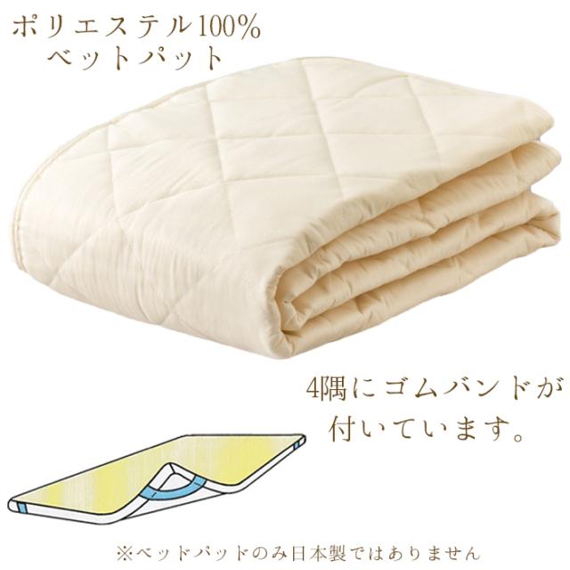 ポリエステルベッドパット 詰物:ポリエステル100% 側生地:ポリエステル100% ※4角スベリ止めゴム付き (ベッドパッドのみ日本製ではありません。) マットレスカバー 綿60%ポリエステル40% (抗菌防臭加工)(ニット生地) 日本製 枕カバー 綿60%ポリエステル40% (抗菌防臭加工) 日本製 |