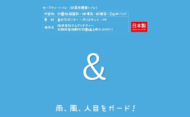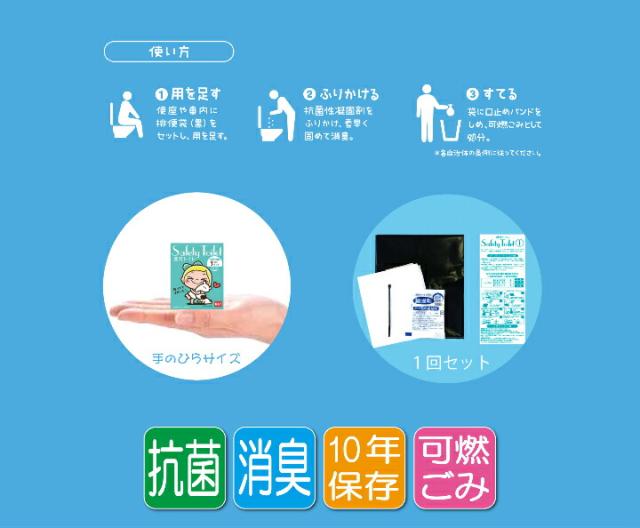 セーフティートイレは地震などの災害時による断水時やドライブ中の渋滞・アウトドアや介護などの緊急時の排泄問題を解消する為に開発された、水がなくても使用できる簡易トイレセットです。