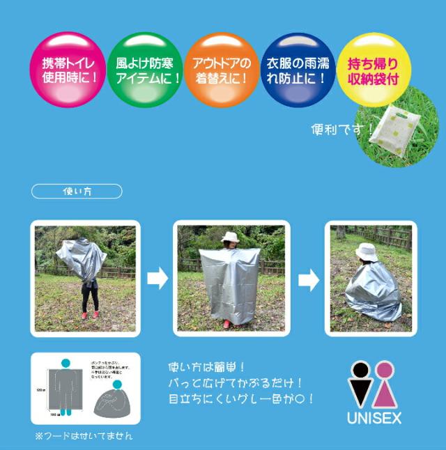 ■ キャンプや山登りなどのアウトドアの着替えや、予想外の渋滞などの携帯トイレ使用時に、パッと広げて頭からかぶるだけで周りの目からガードしてくれます。