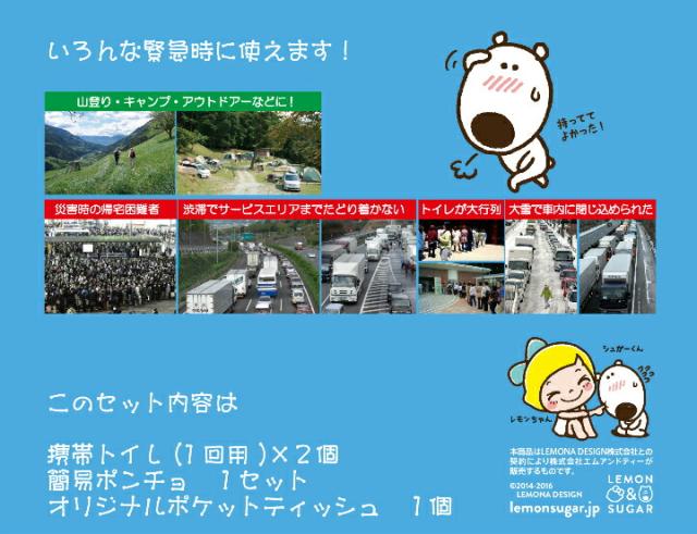 ポンチョ&携帯トイレ2個セット さらにオリジナルポケットティッシュ付きレジャー、渋滞グッズ、ハイキング、キャンプ、ドライブ用品としてオススメ