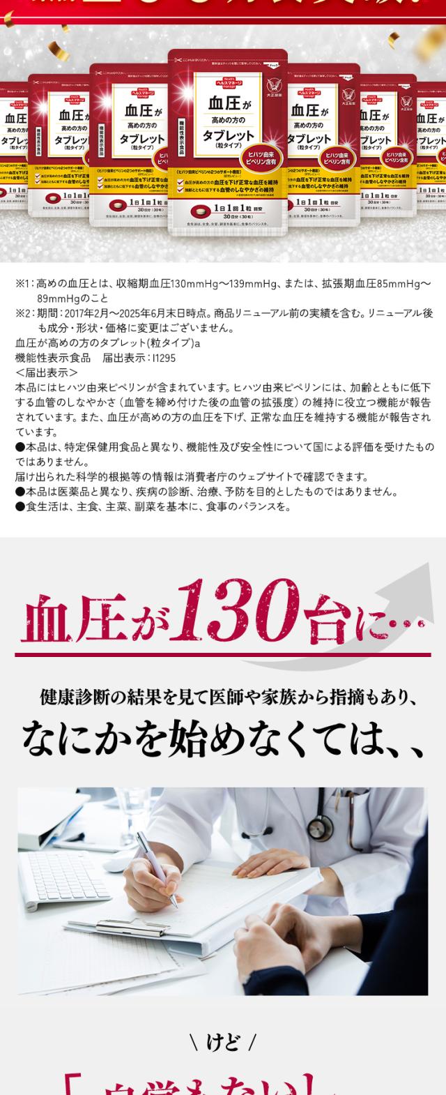 「血圧が高めの方のタブレット(粒タイプ)」は血圧が高めの方の血圧を改善し、正常な血圧を維持する機能がある事が報告されている「ヒハツ由来ピペリン」を含有した機能性表示食品です。