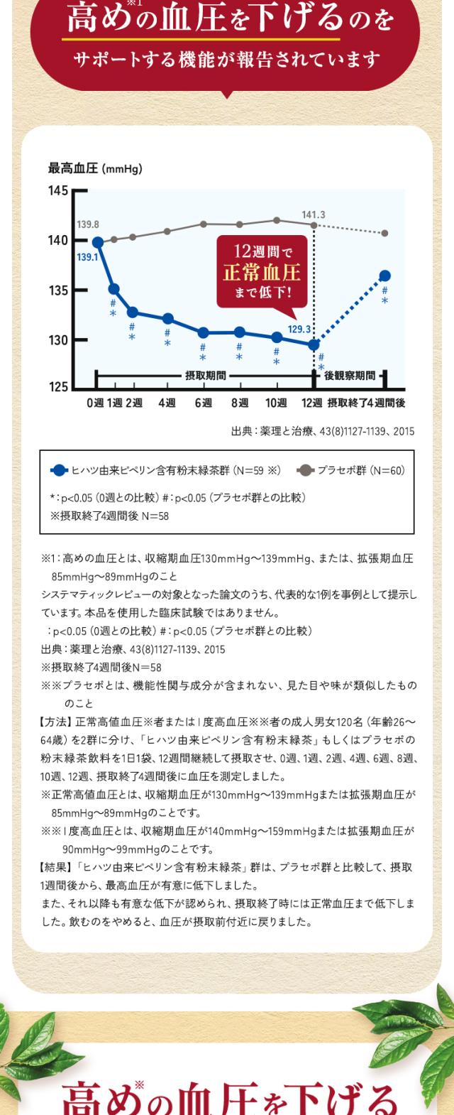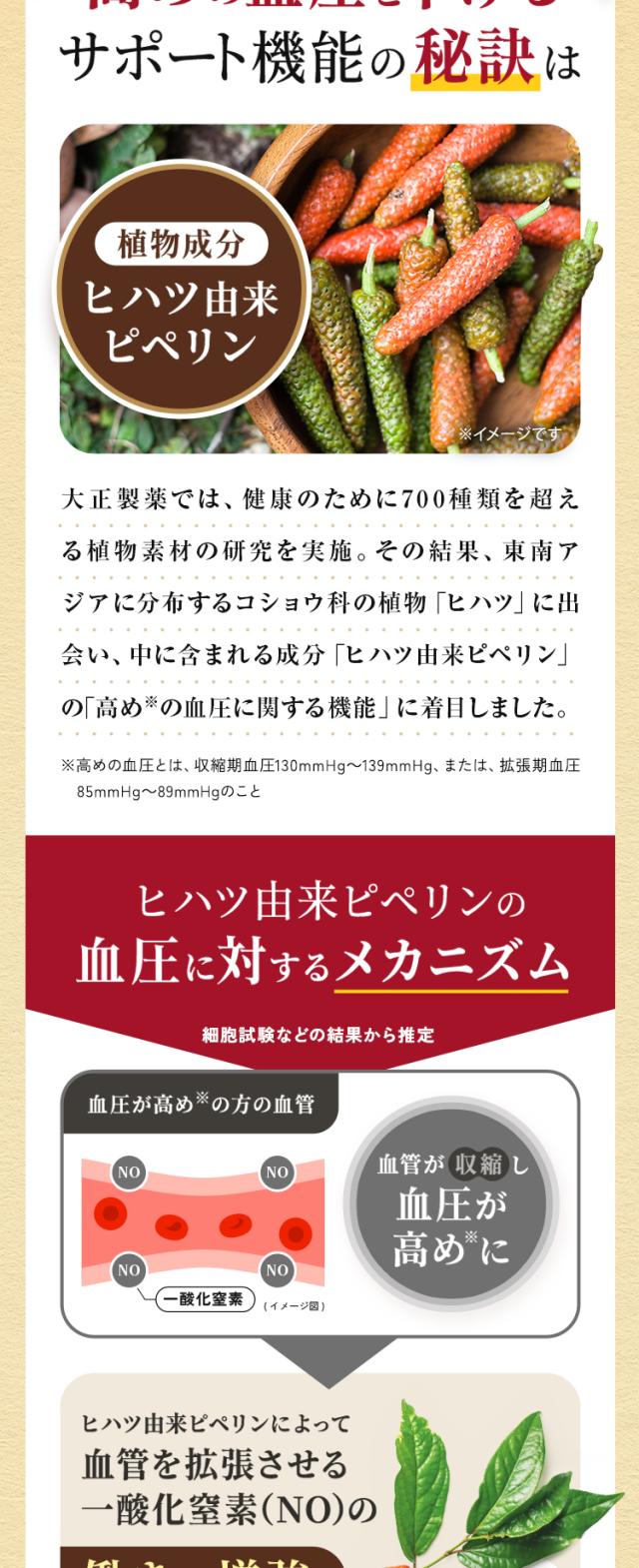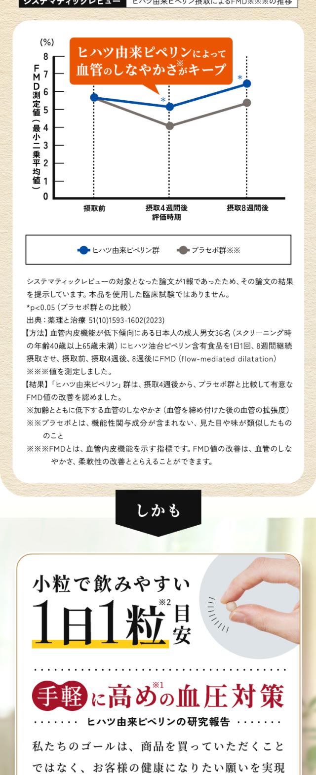 本品にはヒハツ由来ピペリンが含まれています。ヒハツ由来ピペリンには、加齢とともに低下する血管のしなやかさ(血管を締め付けた後の血管の拡張度)の維持に役立つ機能が報告されています。また、血圧が高めの方の血圧を下げ、正常な血圧を維持する機能が報告されています。